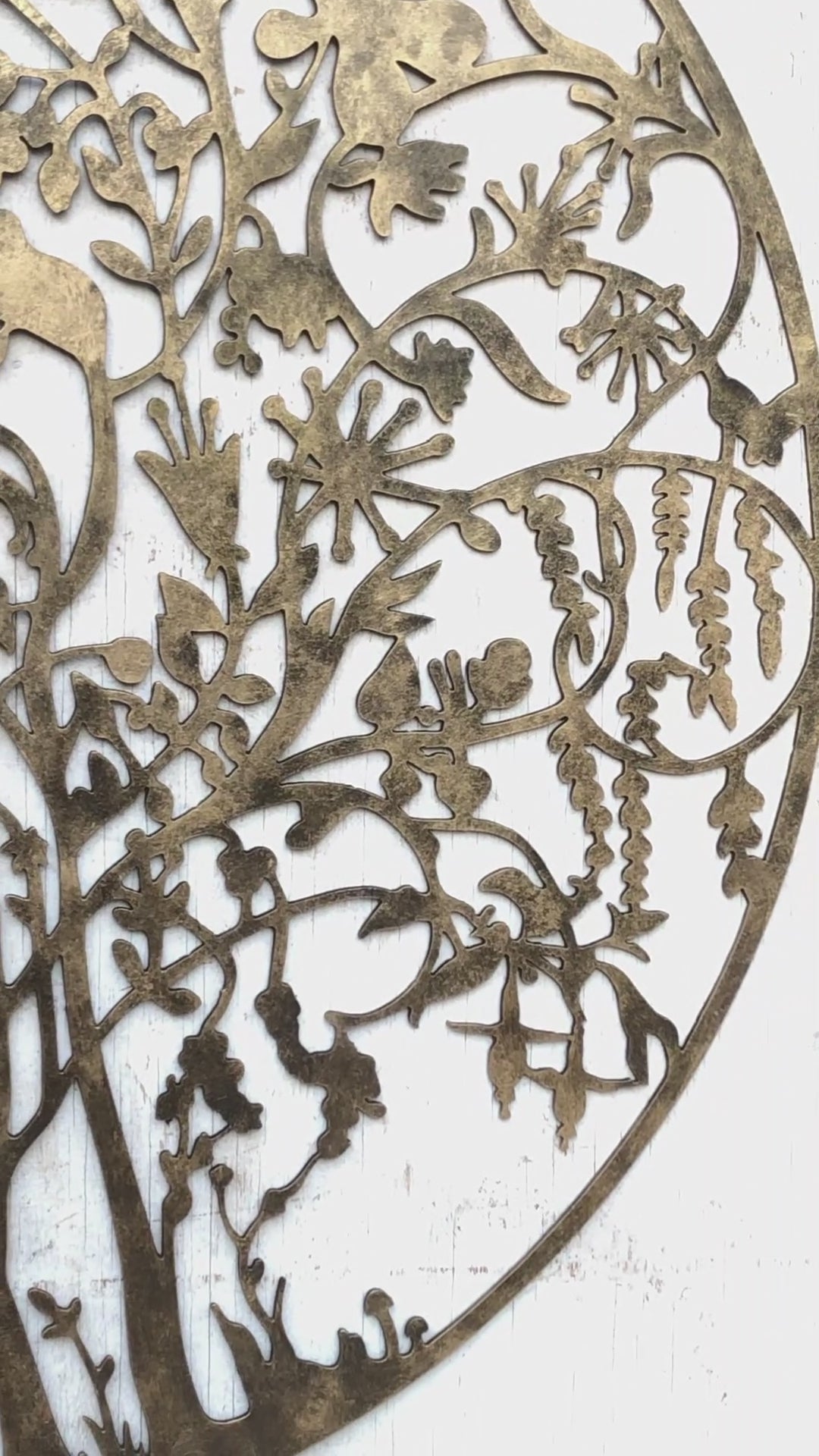 Colgante tipo medallón con diseño de naturaleza y animales en un paisaje al interior de un bosque.